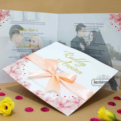 Untuk keterangan lebih lanjut tentang undangan nikah ini termasuk undangan hard cover fullcolour. Undangan ini berbentuk lipat 3 dengan posisi buka ke samping, dan memiliki ukuran 15 x 15 cm, dan untuk jenis kertas yang digunakan sebagai bahan dasar undangan ini adalah jenis kertas ivory.